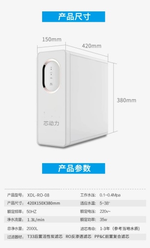 返回目录 芯动力 XDL-RO-08 芯动力净水器 XDL-RO-08 全国统一零售价:4680元 芯动力净水器 XDL-RO-08,让每个家庭喝上健康水 XDL-RO-08 家用直饮厨下式反渗透净水机 精于净水,诚于净芯 净芯 · 净水 · 净享芯动力 全国统一零售价:4680元