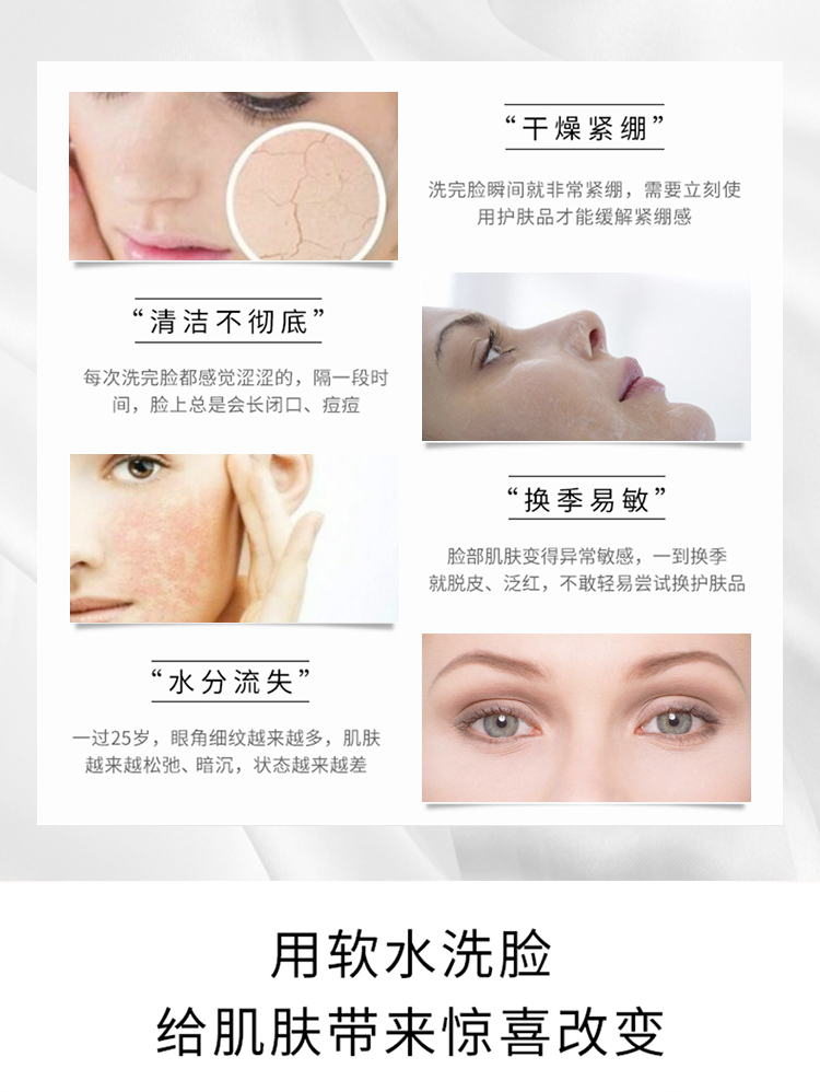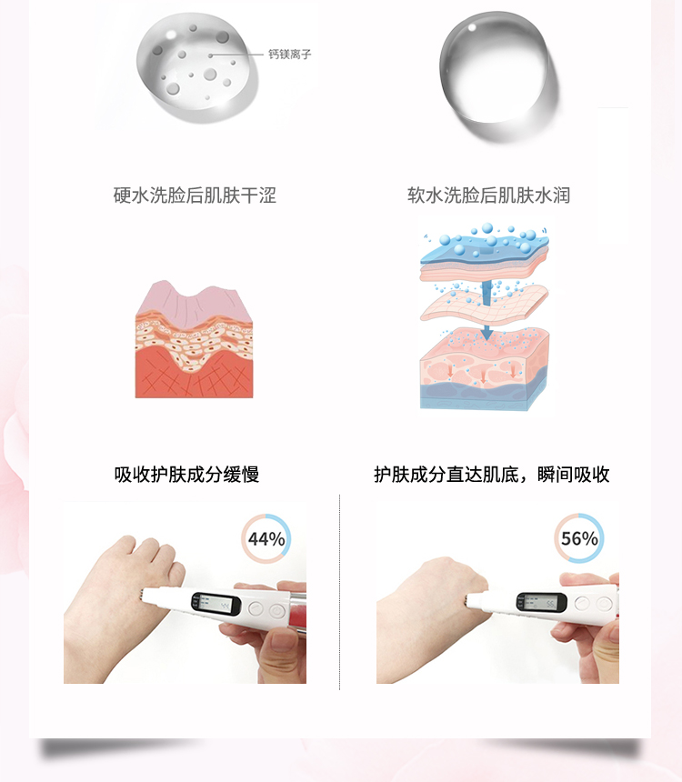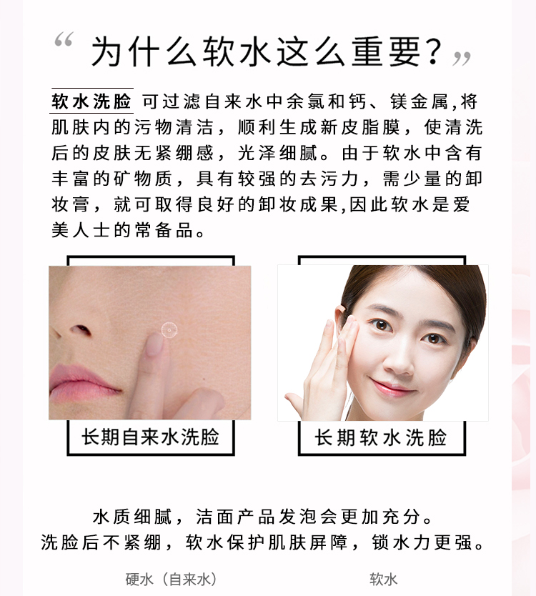 自来水中的钙镁离子会与洗护用品结合,使其无法很好起泡并且深入清洁毛孔。花大价钱买来的洗护用品,结果却不能很好地发挥功效,确实可惜。