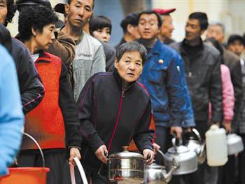 因为水污染,兰州市民排队领取瓶装饮用水。