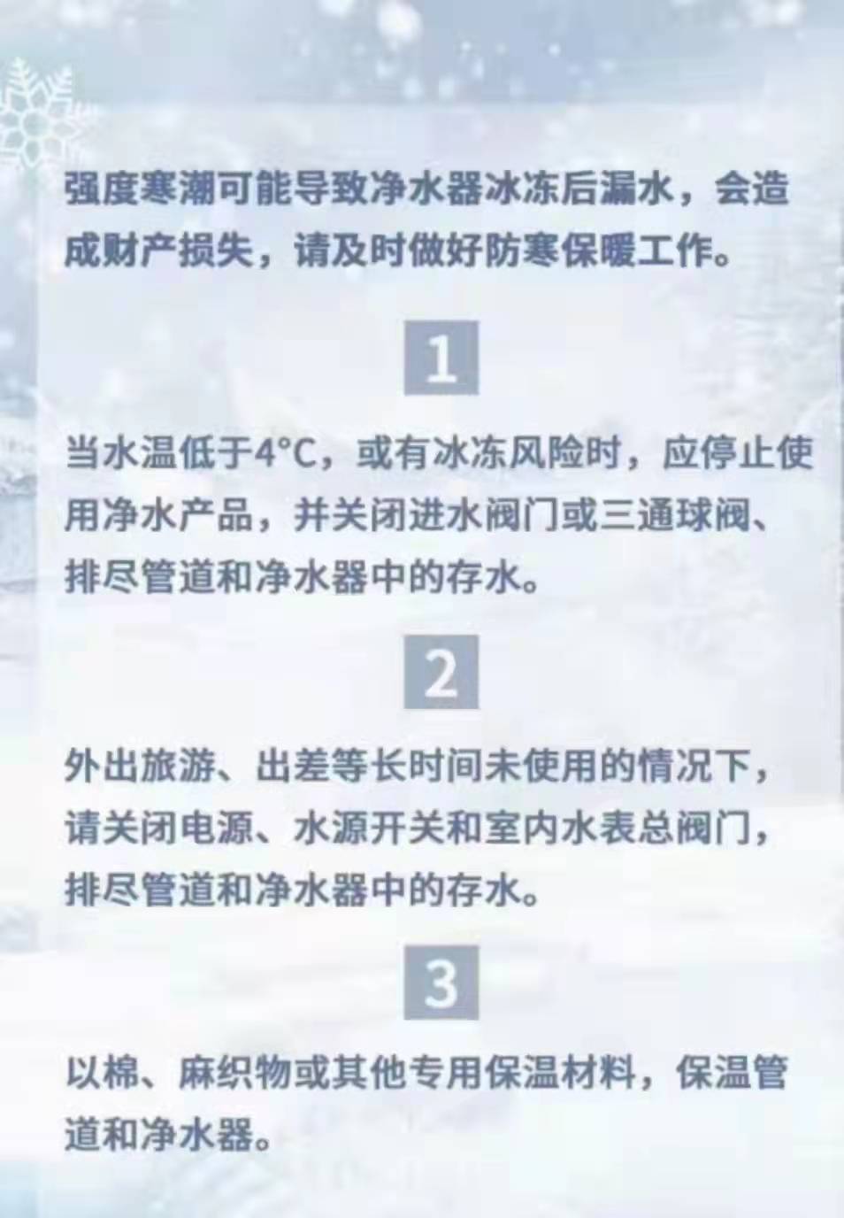 寒潮来袭,气温骤降,芯动力净水在此提醒客户朋友们要注意防寒保暖!同时,别忘了家里的净水器也要注意做好防冻保养工作,才能为您和家人的饮水健康提供更好的保障。