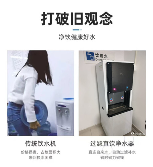 目前很多企业单位饮用水的来源是:桶装水、大小型开水器。商用直饮机为用户提供新鲜、安全、卫生且达到国家要求的水,解决桶装水来路不明、细菌超标等二次污染问题和使用开水器产生的水垢和“千沸水”问题,而商用净水器不需频繁采购、储存、换水,给生活带来更安全健康的舒适体验和工作上的便利。